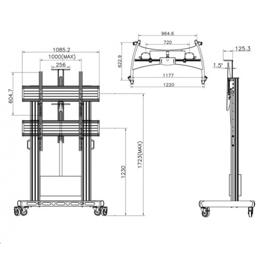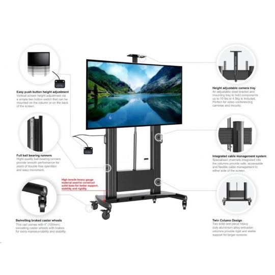 Technické údaje: •nosnost 136,4kg •podporuje VESA standardy 200x200 až 1000x600 •doporučená úhlopříčka 55" až 100" •motorizovaný - plynulé nastavení výšky obrazovky •nastavitelná výška 130 až 170cm (po střed obrazovky) •horní polička na kameru nebo projektor - odnímatelná •systém vedení kabeláže •IR ovládání •stabilní podstava osazena pojezdovými kolečky s brzdou •nejvyšší bezpečnost •spolehlivost •záruka 3 roky Motorizovaný Tv stojan Fiber Mounts TW100 podporuje VESA standardy: •VESA 200x200 •VESA 300x200 •VESA 300x300 •VESA 400x200 •VESA 400x300 •VESA 400x400 •VESA 600x400 •VESA 800x400 •VESA 800x600 •VESA 1000x400 •VESA 100.