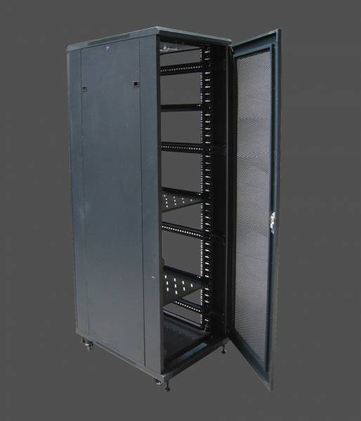 Rozvaděč je standardně vybaven výškově přestavitelnými policemi (3ks pro 42U), panelem se zásuvkami 230V, ventilační jednotkou a sadou spojovacího materiálu. Plechové uzamykatelné dveře na přední i zadní stěně. Odnímatelné boční kryty s možností montáže zámku. Dodáváno v rozloženém stavu.