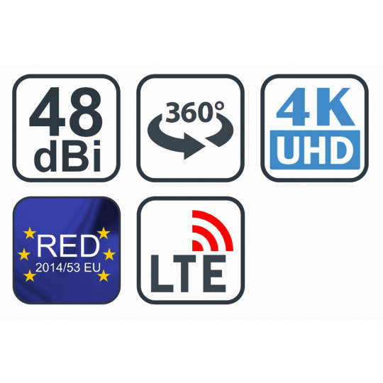 Nová větší verze populární venkovní antény s přijímacím úhlem 360° s kabelem 10m a redukcí IEC female/F male. Nová verze má průměr 380 mm.