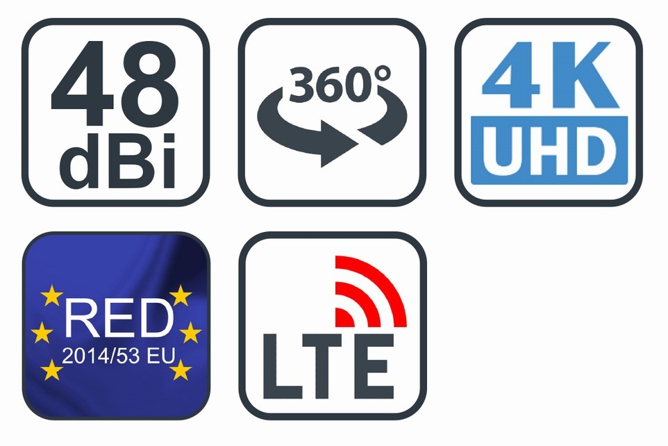 Nová větší verze populární venkovní antény s přijímacím úhlem 360° s kabelem 10m a redukcí IEC female/F male. Nová verze má průměr 380 mm.
