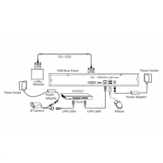 | Obsah balení | NVR jednotka s 8 kanály, SATA připojením pro až 8TB disk 4x IP Bullet IP66 kamera s nočním přísvitem 1x napájecí adaptér DC 12V 2A pro NVR 4x napájecí adaptér DC 12V 1A pro kamery 4x sada pro upevnění kamery 4x bajonetová těsnící krytka pro RJ45 konektor 1xUSB myš 1xSATA kabel pro připojení HDD 1x Uživatelský manuál |