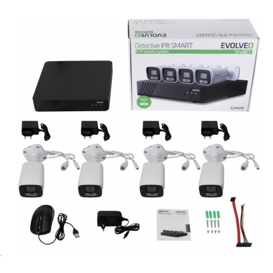 | Ostatní | Smartlife (Tuya) aplikace v CZ pro iOS a Android iCMS Program pro OS Windows Podpora Onvif protokolu Rozeznání pohybu z obrazu Možnost rozšíření o Antivandal kameru, nebo wifi kameru z nabídky EVOLVEO Podpora USB myši (myš v balení) 8 kanálový Full HD rekordér NVR s IP připojením kamer v lokální síti 4× venkovní celokovová kamera s napájecím adaptérem Mikrofon pro záznam zvuku 1/2,9" 2Mp CMOS snímač |