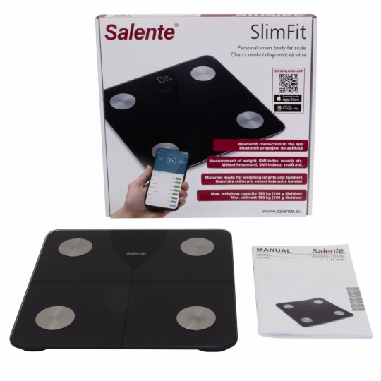 Chytrá osobní diagnostická váha Salente SlimFit s propojením do mobilní aplikace přes Bluetooth umožní sledovat přehledně vývoj tělesné hmotnosti při sportování, dietách i v běžném životě. Váha měří a následně analyzuje 15 parametrů: