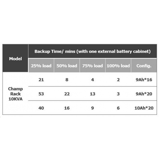 | Backup time - 1x Battery Bank (20pcs 10Ah) | |