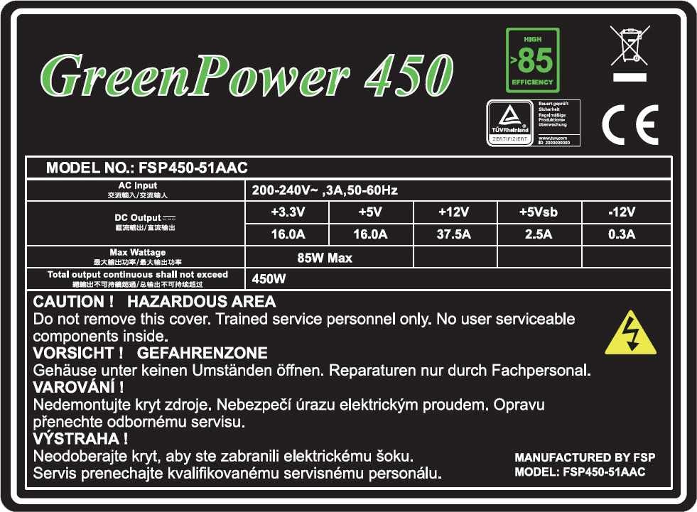 Fortron zdroj 450W GreenPower 450-51AAC, 80+ Bronze