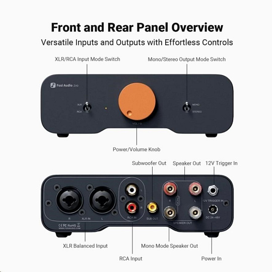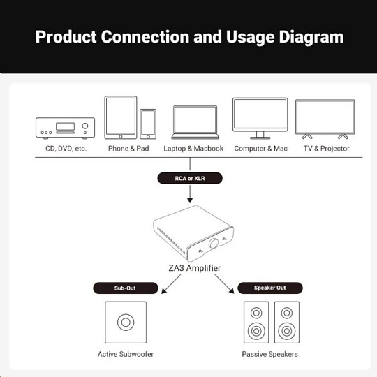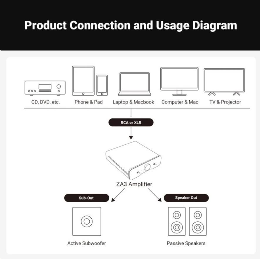 ZA3 byl navržen s ohledem na moderní audio systémy i profesionální využití. Disponuje RCA i XLR vstupy, prémiovými součástkami a pokročilým pasivním chlazením, které zajišťuje stabilitu při dlouhodobém provozu.
