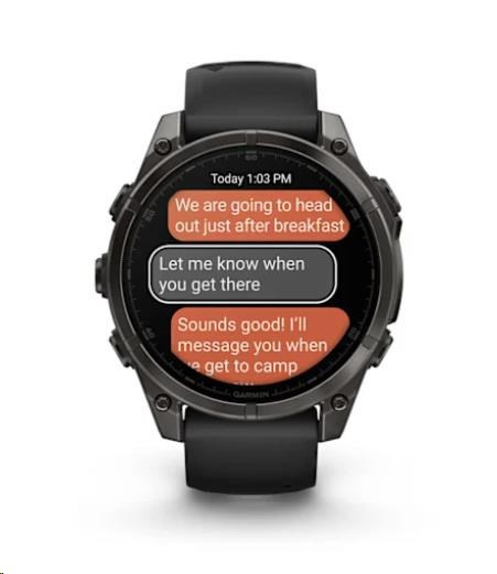 Na hodinkách můžete přijímat e-maily, textové zprávy a upozornění na spárovaném telefonu Android nebo Apple. Hodinky rovněž podporují platby Garmin Pay, abyste se při svých dobrodružstvích mohli vydat kamkoliv a nestarat se o to, že jste něco zapomněli doma. S hodinkami Garmin fénix 8 máte totiž vždy všechno důležité po ruce - na svém zápěstí.