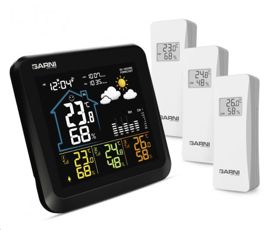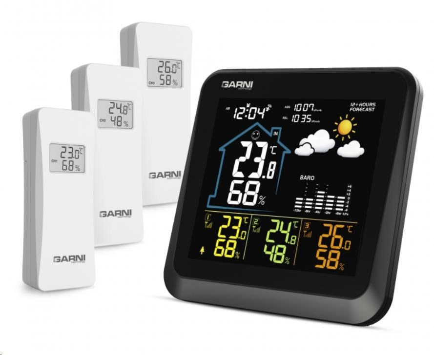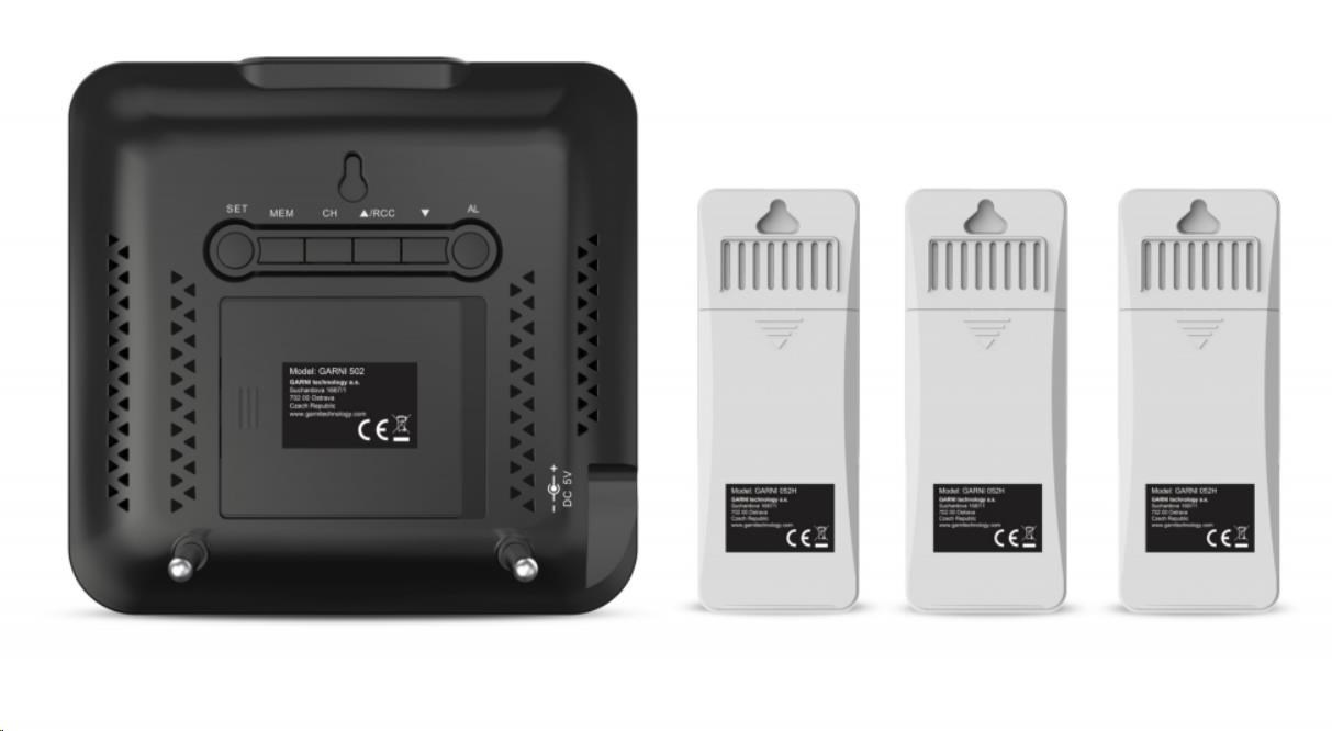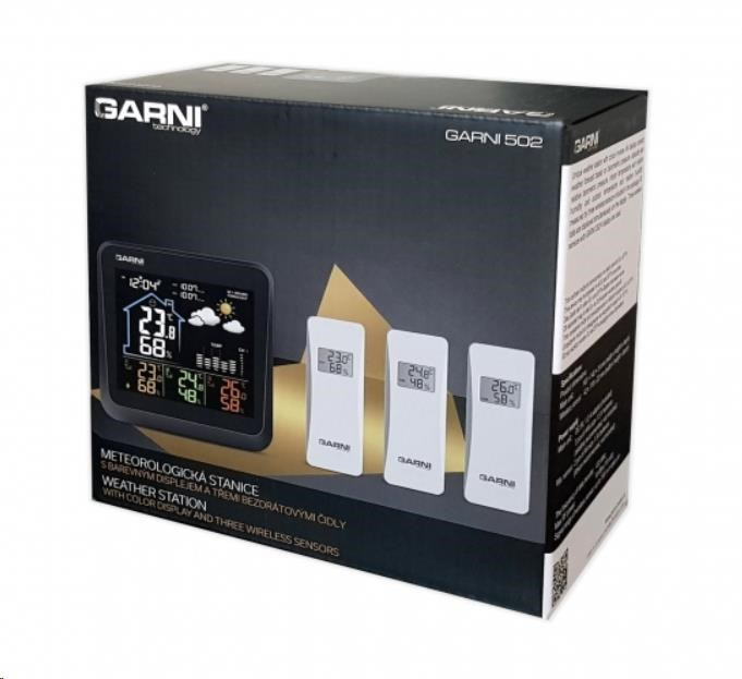 Meteorologická stanice se 3 bezdrátovými čidly pro měření vnější teploty a relativní vlhkosti, špičkovým inverzním barevným VA displejem s časem a datem řízenými rádiovým signálem DCF-77, budíkem, grafem, měřením vnitřní teploty, relativní vlhkosti a absolutního a relativního barometrického tlaku. Zobrazení všech měřených hodnot na displeji současně. špičkový inverzní barevný VA displej o rozměrech 106 x 94 mm s možností stálého osvětlení při napájení síťovým adaptérem, nebo krátkodobým osvětlením na 10 s při napájení bateriemi tři stupně jasu osvětlení displeje (při napájení síťovým adaptérem) a možnost vypnutí osvětlení displeje velikost číslic na displeji – čas, datum 7 mm, vnitřní teplota 21 mm, vnitřní relativní vlhkost 14 mm, vnější teplota 12,5 mm, vnější relativní vlhkost 10 mm, barometrický tlak 4,5 mm barvy na displeji: čas, barometrický tlak, vnitřní teplota a rel. vlhkost, graf bílá, teplota a rel. vlhkost na kanálu č.1 žlutá, na kanálu č.2 zelená a na kanálu č.3 oranžová čas a datum řízené signálem DCF-77 s možností manuálního nastavení ikona příjmu signálu DCF-77 12ti, nebo 24 hodinový formát zobrazení času možnost nastavení časového pásma od -12 do +12 hodin budík s funkcí opakovaného buzení (Snooze) po 5 minutách budící signál - 10 sekund 1 pípnutí za sekundu, 10 sekund 2 pípnutí za sekundu, 10 sekund 4 pípnutí za sekundu a poté stálé pípání 5 ikon předpovědi počasí (jasno, polojasno, oblačno, srážky (déšť), srážky (sněžení) na základě sledování barometrického tlaku vestavěným barometrickým čidlem možnost nastavení výchozí ikony předpovědi počasí zobrazení hodnot vnitřní a vnější teploty a relativní vlhkosti ze všech 3 čidel současně zobrazení teploty ve °C, nebo °F zobrazení barometrického tlaku absolutního a relativního (hPa/mb nebo mmHg) možnost nastavení hodnoty relativního barometrického tlaku graf vývoje bar. tlaku, vnitřní a vnější teploty na všech třech kanálech za uplynulých 12 hodin paměť na maximální a minimální naměřené hodnoty teploty a rel. vlhkosti 3 ikony vnitřní tepelné pohody 3 bezdrátová čidla GARNI 052H jsou součástí balení bezdrátový přenos hodnot vnější teploty relativní vlhkosti na frekvenci 433 MHz ikona slabých baterií hlavní jednotky a venkovních čidel napájení hlavní jednotky síťovým adaptérem nebo bateriemi délka kabelu síťového adaptéru 1,80 m možnost postavení, nebo zavěšení barva černá Bezdrátové čidlo GARNI 052H vlhkosti odolné displej o rozměrech 25 x 12 mm velikost číslic na displeji: teplota 7 mm a relativní vlhkost 6 mm měření teploty a relativní vlhkosti 3 kanály maximální RF výkon 10 dBm (10 mW) možnost postavení, nebo zavěšení barva bílá Obsah balení: 1 x hlavní jednotka GARNI 502 3 x bezdrátové čidlo GARNI 052H 1 x síťový adaptér český, slovenský, německý, anglický, polský, maďarský a nizozemský návod.