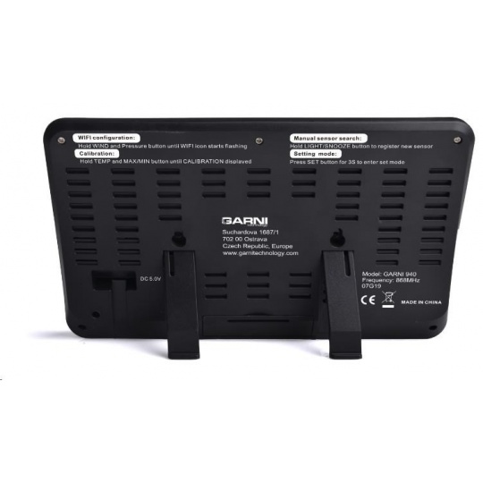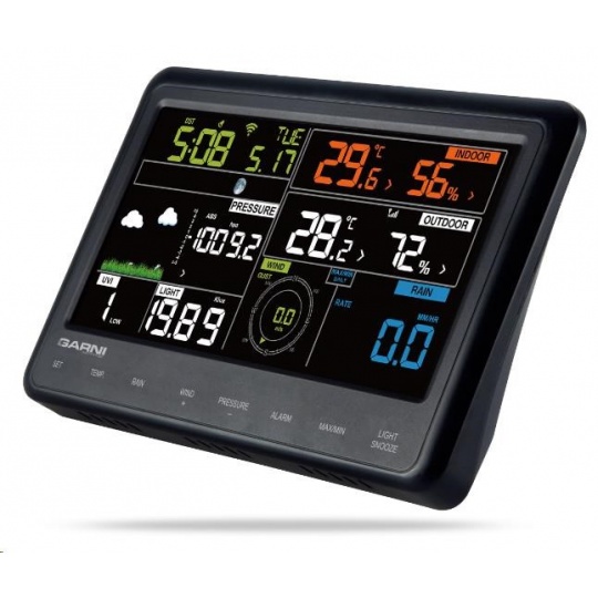 Meteorologická stanice se špičkovým inverzním barevným VA displejem s časem a datem řízenými rádiovým signálem DCF-77, budíkem, měřením vnitřní teploty, relativní vlhkosti a absolutního barometrického tlaku a bezdrátovým čidlem pro měření vnější teploty a relativní vlhkosti. - špičkový inverzní barevný VA displej o rozměrech 106 x 94 mm s možností stálého osvětlení při napájení síťovým adaptérem, nebo krátkodobým osvětlením na 10 s při napájení bateriemi - tři stupně jasu osvětlení displeje (při napájení síťovým adaptérem) - velikost číslic na displeji – čas, datum a zkratka názvu dne 10 mm, vnitřní teplota a relativní vlhkost - 17 mm, vnější teplota a relativní vlhkost 19 mm, barometrický tlak 4,5 mm - čas a datum řízené signálem DCF-77 s možností manuálního nastavení - ikona příjmu signálu DCF-77 - 12ti, nebo 24 hodinový formát zobrazení času - možnost nastavení časového pásma od -12 do +12 hodin - budík pro buzení každý den, nebo v pracovní dny s funkcí opakovaného buzení (Snooze) po 5 minutách - budící signál - 10 sekund 1 pípnutí za sekundu, 10 sekund 2 pípnutí za sekundu, 10 sekund 4 pípnutí za sekundu a poté stálé pípání - 6 ikon předpovědi počasí (jasno, polojasno, oblačno, srážky (déšť), srážky (sněžení), přívalové srážky) na základě sledování barometrického tlaku vestavěným barometrickým čidlem - zobrazení hodnot vnitřní a vnější teploty a relativní vlhkosti - šipky vývoje teploty, relativní vlhkosti - alarm horní a dolní meze venkovní teploty v rozsahu od -40°C do +70°C a to pro každý kanál zvlášť. - měření absolutního barometrického tlaku (hPa/mb nebo mmHg) - zobrazení teploty ve °C, nebo °F - paměť na maximální a minimální naměřené hodnoty teploty a rel. vlhkosti s automatickým nulováním ve 0:00 hodin - možnost použití až 3 bezdrátových čidel GARNI 045H (jedno čidlo je součástí dodávky) - funkce automatického přepínání kanálů na kterých jsou bezdrátová čidla přihlášená po 5 s - bezdrátový přenos hodnot vnější teploty relativní vlhkosti na frekvenci 433 MHz - zobrazení fáze Měsíce - ikona slabých baterií hlavní jednotky a venkovního čidla - napájení hlavní jednotky síťovým adaptérem nebo bateriemi - délka kabelu síťového adaptéru 1,75 m - možnost postavení, nebo zavěšení - barva černá se stříbrným rámečkem Bezdrátové čidlo GARNI 045H - displej o rozměrech 18 x 10 mm - velikost číslic na displeji: teplota 4 mm a relativní vlhkost 3,5 mm - měření teploty a relativní vlhkosti - možnost postavení, nebo zavěšení - barva bílá Obsah balení: 1 x hlavní jednotka GARNI 525 1 x bezdrátové čidlo GARNI 045H 1 x síťový adaptér český, slovenský, německý, anglický, polský, maďarský a italský návod.