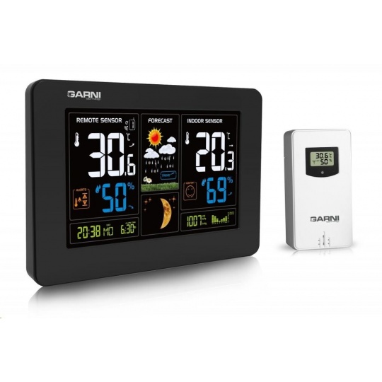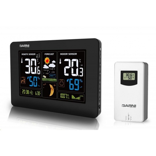Meteorologická stanice s inverzním barevným displejem s časem a datem řízenými rádiovým signálem DCF-77, budíkem, měřením vnitřní teploty, relativní vlhkosti a absolutního barometrického tlaku, bezdrátovým čidlem pro měření vnější teploty a relativní vlhkosti. inverzní barevný TN (LCD) displej o rozměrech 110 x 73 mm s možností stálého osvětlení při napájení síťovým adaptérem, nebo krátkodobým osvětlením na 10 s při napájení bateriemi dva stupně jasu osvětlení displeje, možnost vypnutí osvětlení displeje (při napájení síťovým adaptérem) velikost číslic na displeji – čas 8,5 mm, datum a zkratka názvu dne 5 mm, vnitřní a vnější teplota 21 mm, vnitřní a vnější relativní vlhkost 23 mm, barometrický tlak 8 mm čas a datum řízené signálem DCF-77 s možností manuálního nastavení ikona příjmu signálu DCF-77 12ti, nebo 24 hodinový formát zobrazení času možnost nastavení časového pásma od -12 do +12 hodin budík s funkcí opakovaného buzení (Snooze) po 5 minutách budící signál - 10 sekund 1 pípnutí za sekundu, 10 sekund 2 pípnutí za sekundu, 10 sekund 4 pípnutí za sekundu a poté stálé pípání 6 ikon předpovědi počasí (jasno, polojasno, oblačno, srážky (déšť), srážky (sněžení), přívalové srážky) na základě sledování barometrického tlaku vestavěným barometrickým čidlem zobrazení hodnot vnitřní a vnější teploty a relativní vlhkosti měření absolutního barometrického tlaku (mb/hPa nebo inHg) zobrazení teploty ve °C, nebo °F paměť na maximální a minimální naměřené hodnoty teploty a rel. vlhkosti s automatickým nulováním ve 0:00 hodin možnost použití až 3 bezdrátových čidel GARNI 045H (jedno čidlo je součástí dodávky) funkce automatického přepínání kanálů na kterých jsou bezdrátová čidla přihlášená po 5 s bezdrátový přenos hodnot vnější teploty relativní vlhkosti na frekvenci 433 MHz zobrazení fáze Měsíce ikona slabých baterií hlavní jednotky a venkovního čidla napájení hlavní jednotky síťovým adaptérem nebo bateriemi délka kabelu síťového adaptéru 1,80 m možnost postavení, nebo zavěšení barva černá se stříbrným rámečkem Bezdrátové čidlo GARNI 045H displej o rozměrech 18 x 10 mm velikost číslic na displeji: teplota 4 mm a relativní vlhkost 3,5 mm měření teploty a relativní vlhkosti možnost postavení, nebo zavěšení barva bílá Obsah balení: 1 x hlavní jednotka GARNI 520 1 x bezdrátové čidlo GARNI 045H 1 x síťový adaptér český, slovenský, německý, anglický, polský, maďarský a italský návod.