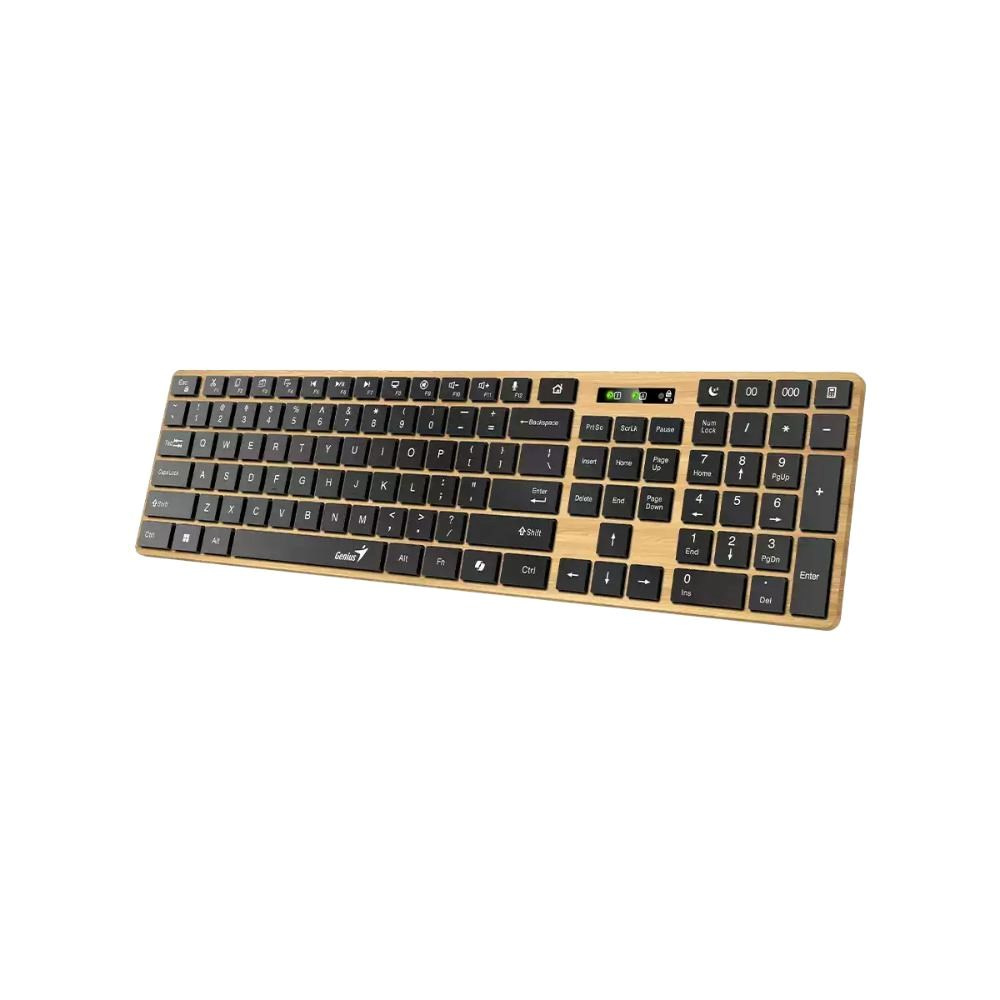 Genius SlimStar 7250BT představuje moderní bezdrátovou klávesnici s elegantním designem inspirovaným severským borovým dřevem. Nabízí duální připojení prostřednictvím Bluetooth 5.0 nebo 2,4GHz bezdrátové technologie s dosahem až 10 metrů. Klávesnice je ideální pro širokou škálu zařízení včetně stolních počítačů, notebooků, mobilních telefonů, tabletů i chytrých televizorů.