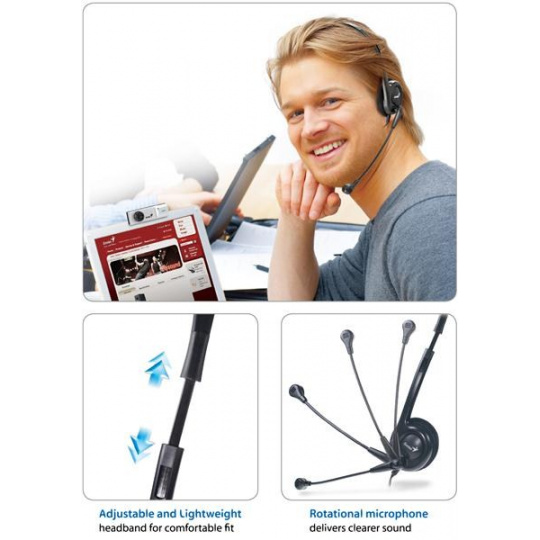 | Popis produktu: • Nastavitelná velikost • Měkké sluchátka • Otočný mikrofon • Vhodné pro MSN, SKYPE a chatování po internetu Frekvenční rozsah: 20Hz~20KHz Citlivvost sluchátek: 105dB Impedance (@1KHz): 32ohm Délka kabelu: 1.8m Citlivost mikrofonu: -38dB Rozhraní: 3.5mm jack Ovládání hlasitosti: Ne Hmotnost: 57g
