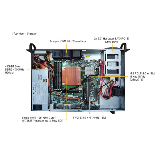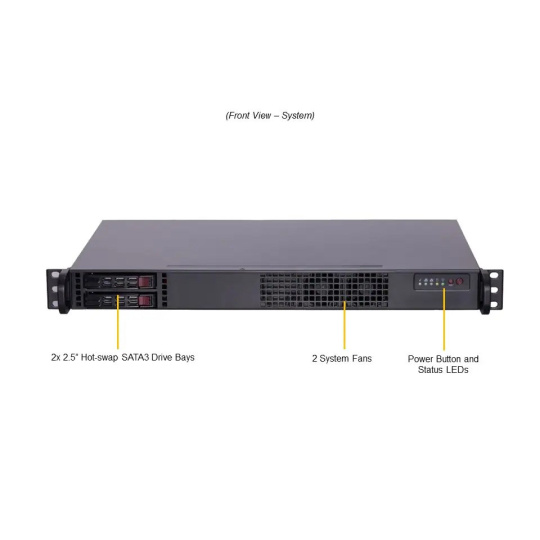 SYS-111AD-HN2-02-G1 CPU: Core i7-12700E Memory: 1x 32GB DDR5-4800 Storage: 1x 1.9TB 2.5" SATA Network: 2x 1G RJ45 1U short-depth front I/O, 2 hot-swap 2.5" SATA drives, 1x PCIe 5.0 x16 (HHHL).