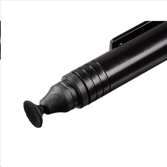 - pro vysoce efektivní a šetrné čištění všech optických ploch, speciálně vyvinuto pro objektivy a filtry - dlouhá životnost, protože jde o suché čištění, což znamená, že produkt neobsahuje žádnou kapalinu, která by mohla vyschnout - odstraňuje prach, mastná místa a jiné šmouhy - součástí je štětec pro prvotní odstranění větších nečistot - vytvarováno pro pohodlné držení - klip pro připevnění, např. ke kapse na košili/tričku - zahnutá čisticí plocha ze speciálního sametu - průměr čistící plochy: 13 mm - délka pera: 12,5 cm - materiál pera: plast - materiál čistící plochy: speciální samet - barva: černá Návod k použití: 1. Pomocí červeného posuvného tlačítka vysuňte štětec. Pomocí štětce odstraňte větší částečky nečistot. 2. Sundejte ochranný kryt na opačném konci pera. Pomocí sametové čisticí plochy, krátkými krouživými pohyby, odstraňte nečistoty z optického povrchu. Po skončení čištění opět nasaďte ochranný kryt a jedenkrát otočte, abyste aktivovali čisticí vlákna. 3. Pro hůře odstranitelné znečištění dýchnete na optickou plochu a čistící proces opakujte. Upozornění: Nevhodné pro čištění zrcadel fotoaparátů. Tento produkt je vhodný pouze k čištění malých optických povrchů..