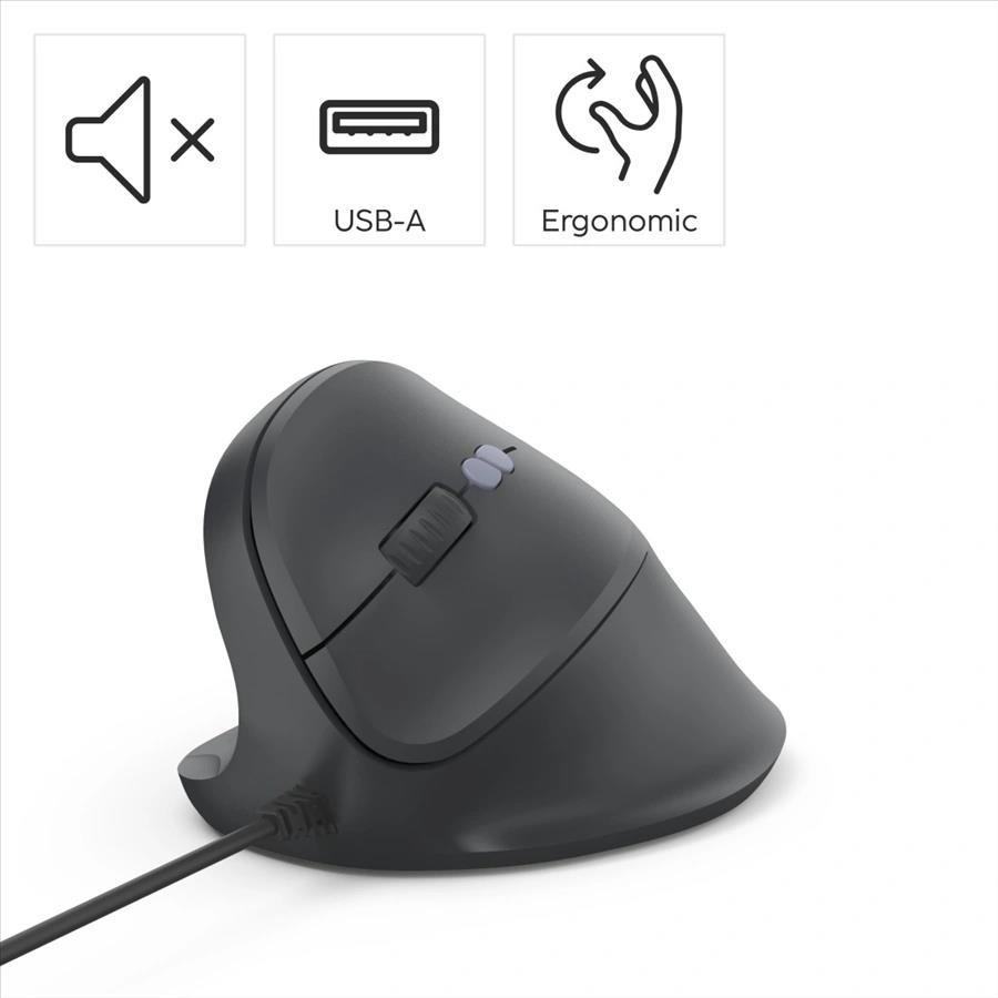 - moderní ergonomická kabelová myš pro pracování s počítačem bez bolesti - vertikální provedení předchází namožení a bolesti ramen a zápěstí - tichá, bez zvuků při klikání pro nerušenou práci - DPI tlačítko pro rychlou změnu rozlišení (DPI 1000/1400/1800) - aktivace AI asistenta v systému tlačítkem - tlačítka s funkcí zpět/vpřed v prohlížeči - pogumovaný povrch myši a kolečka - polymerové kluzné plochy - dlouhý kabel s připojením k USB-A nebo USB-C zásuvce (integrovaný adaptér) - tělo a tlačítka jsou vyrobena z 65% z recyklovaného ABS plastu - balení je 100% bez plastů Systémové požadavky: - běžné funkce: Windows 11/10, Mac OS 11 nebo novější - tlačítko Assist: Windows 11 s aplikací Microsoft Copilot Technické parametry: - připojení: USB-A vidlice, USB-C vidlice - počet tlačítek: 7 včetně rolovacího kolečka - rozlišení: 1000/1400/1800 DPI - délka kabelu: 1,8 m - rozměry: 8,6 x 11,5 x 7,1 cm - hmotnost: 110 g - barva: černá.