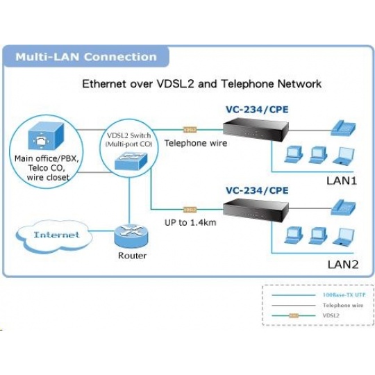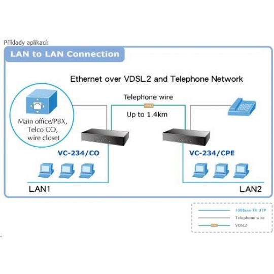 Ethernet po telefonním vedení (technologie VDSL2). 4x LAN RJ-45, 2x RJ-11 konektor pro VDSL2 a POTS. 100/100Mbps na 300m.Transparentní bridge. Dosah až 1,4km. Nastavení DIP přepínači. Volitelně Master (CO) / Slave (CPE). Vestavěný splitter.  Výkonný LRE (Long Reach Ethernet) konvertor ethernetu na VDSL2 (Very-high-data-rate Digital Subscriber Line 2) dovoluje přenést data symetrickým párem vodičů rychlostí až 100Mbitů/s na 300m nebo 20/4Mbps do vzdálenosti až 1,4km. Integrovaný splitter zachová hlasovou službu na telefonním vedení bez další úpravy zapojení, datový provoz se jednoduše přidruží k existujícímu hlasovému. S výhodou tak lze využít telefonní kabelová vedení původně určená pro spojení nejenom k účastníkům ale i mezi analogovými ústřednami. ISP (internet service provider) je tak umožněno nabízet multimediální služby, VOD (video on demand), VoIP (voice over IP), Video phone, IPTV, apod. Zařízení je univerzální jako master (CO) / slave (CPE) jednotka, nastavení režimu přepínačem. Jednotka podporuje VDSL2 operační módy "17a" a "30a" a také "band Plan997" postihující symetrický přenos dat vyšší rychlostí.  Vlastnosti: - 2x port RJ-11 pro VDSL a POTS (Plain Old Telephone Service) - 4x LAN 10/100Base-TX, Switching, Full Duplex (100/200 Mbps), Auto-Negotiation (10/100 Mbps)  - transparentní pro IEEE 802.1Q VLAN tag - parametry nastavované DIP přepínači na zařízení: volba CPE/CO, volba modulace, volba komunikačního limitu, volba SNR - podpora standardů: IEEE 802.3, 10Base-T, IEEE 802.3u, 100Base-TX, IEEE 802.3x - splňuje VDSL standardy ITU-T G.993.1, ITU-T G.997.1, ITU-T G.993.2 - rozměry: 155 x 86 x 26mm - hmotnost: 368g - externí zdroj 5V/2A - provozní teplota okolí: 0 až 50°C  Dosahy a rychlosti na vedení s vodiči AWG24 a lepších: > 17a profile (Downstream / Upstream) - 200m -> 99/70Mbps - 400m -> 99/60Mbps - 600m -> 90/45Mbps - 800m -> 50/28Mbps - 1000m -> 40/12Mbps - 1200m -> 20/7Mbps - 1400m -> 20/4Mbps  > 30a profile (Downstream / Upstream) - 300m -> 100/100Mbps - 400m -> 90/90Mbps - 600m -> 69/55Mbps - 800m -> 48/9Mbps.