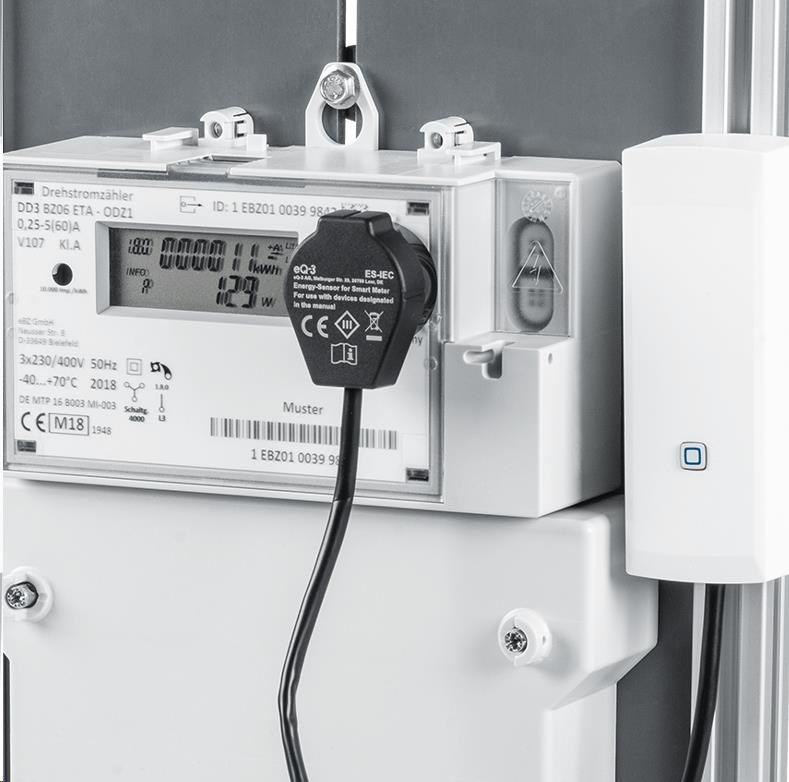 Rozhraní pro chytré elektroměry si na elektroměr jednoduše namontujete sami: Elektronické elektroměry pro domácnosti mají optické datové rozhraní podle normy IEC 62056-21\. Kolem tohoto tzv. informačního rozhraní je osazena kovová destička, takže magnetickou čtecí hlavu lze snadno upevnit na místo. Magnetický senzor se na ni jednoduše uchytí. Senzor se pak připojí k rozhraní (vyhodnocovací jednotka) a prostřednictvím aplikace se integruje do vaši instalace - hotovo!