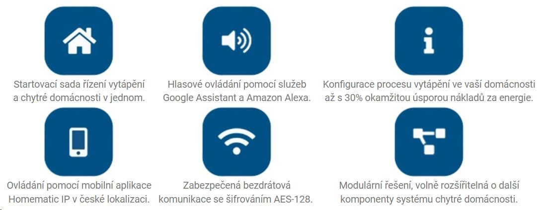 Startovací sada pro řízení vytápění HmIP-SET3 určená pro počáteční integraci chytré domácnosti Homematic IP. Sada obsahuje osm základních prvků pro spolehlivé řešení regulace vytápění a vzdálené řízení prostorové teploty v místnosti dle individuálních potřeb, což vede k okamžité úspoře a snížení výdajů na energie až o 30 %. Sada obsahuje Centrální jednotku HmIP-HAP, 4x Termostatickou hlavici HmIP-eTRV-2, 3x Nástěnný termostat se senzorem teploty a vlhkosti HmIP-WTH-1 a bezplatnou mobilní aplikaci v CZ lokalizaci dostupnou pro operační systém Android a iOS.