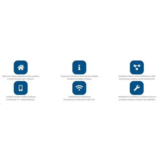 | Ovládání pomocí mobilní aplikace Homematic IP v české lokalizaci | Zabezpečená bezdrátová komunikace se šifrováním AES-128 | Bezdrátová komunikace a bateriový provoz umožňuje snadnou instalaci bez kabeláže |