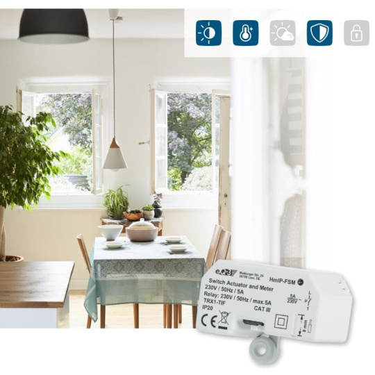 Spínací akční člen (HmIP-FSM) se montuje do standardní zápustné krabice pod omítku nebo do krabice pro povrchovou montáž s připojením do sítě 230 V. Bezdrátová komunikace nabízí možnost instalace bez potřeby druhotné kabeláže. To znamená, že akční člen lze umístit v místě připraveného nebo stávajícího elektrického rozvodu sítě 230 V.