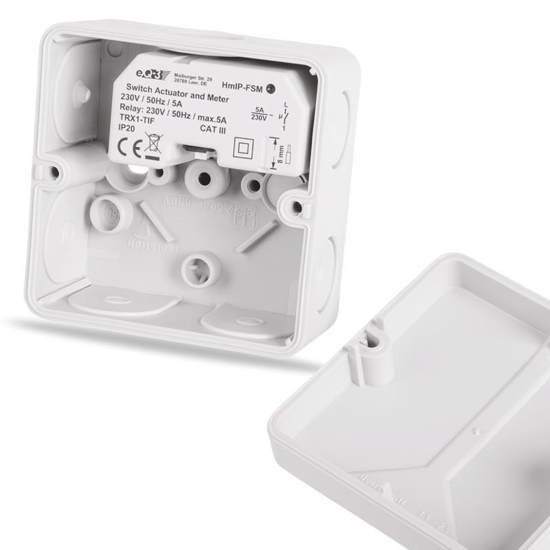 Spínací akční člen (HmIP-FSM) se montuje do standardní zápustné krabice pod omítku nebo do krabice pro povrchovou montáž s připojením do sítě 230 V. Bezdrátová komunikace nabízí možnost instalace bez potřeby druhotné kabeláže. To znamená, že akční člen lze umístit v místě připraveného nebo stávajícího elektrického rozvodu sítě 230 V.