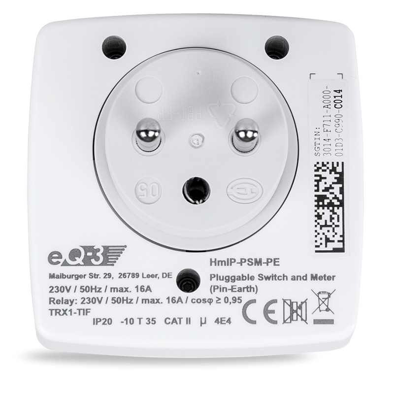 Spínaná bezdrátová zásuvka (HmIP-PSM-PE) s funkcí měření umožňuje spínání připojených zařízení. Umožní spínat a vypínat připojené spotřebiče, měřit jejich spotřebu energie, napětí, proud a výkon. Připojená zařízení lze ovládat manuálně přímo tlačítkem na zásuvce nebo vzdáleně v kombinaci s Centrální jednotkou (HmIP-HAP) a mobilní aplikací Homematic IP.