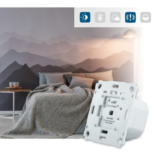 Stmívací akční člen (HmIP-BDT) se montuje do standardní zápustné krabice pod omítku s připojením do sítě 230 V. Bezdrátová komunikace nabízí možnost instalace bez potřeby druhotné kabeláže. To znamená, že akční člen lze umístit v místě připraveného nebo stávajícího elektrického rozvodu sítě 230 V.