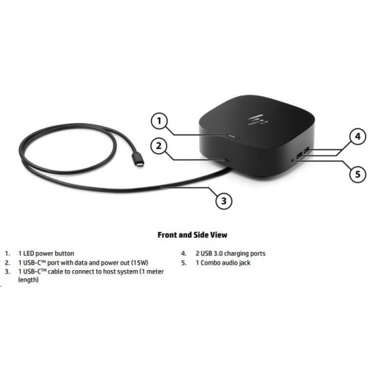 | Obsah balení | Dok HP USB-C® G5; Adaptér AC; Napájecí kabel AC; Produktové listy; Záruka; Úvodní příručka |