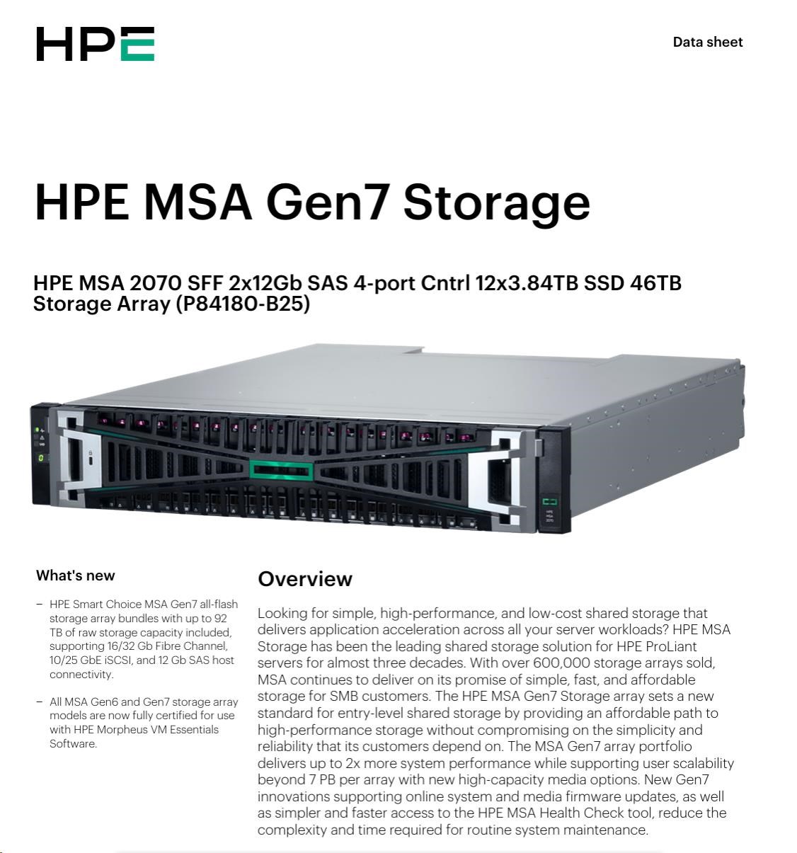HPE MSA 2070 SFF 2x12Gb SAS 4-port Controller 12x3.84TB SSD 46TB Storage Array Smart Choice.