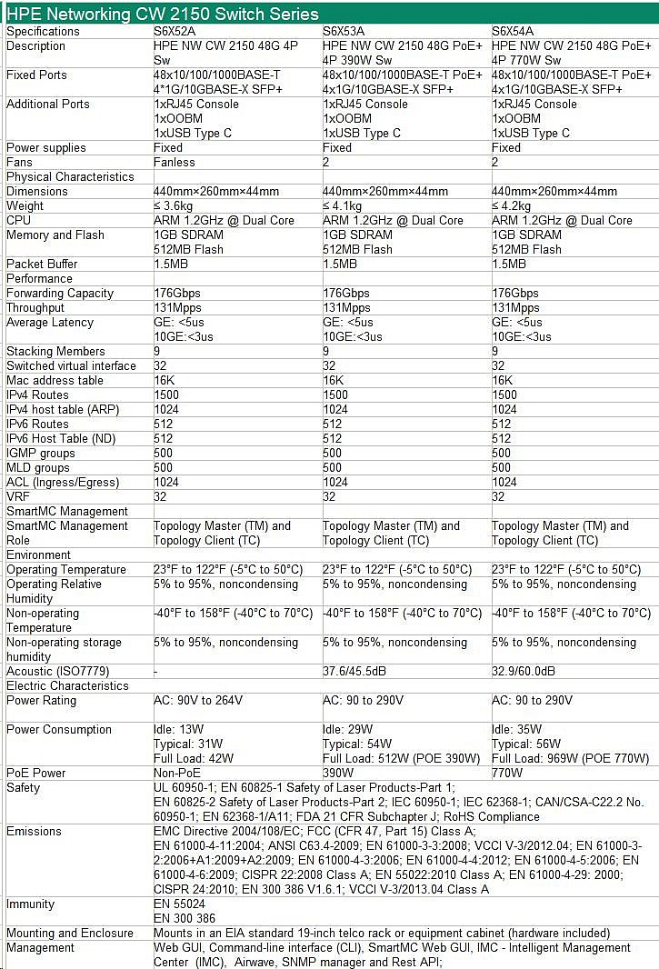HPE Networking CW 2150 48p 10M/100M/1G 4p SFP+ 1G/10G Switch