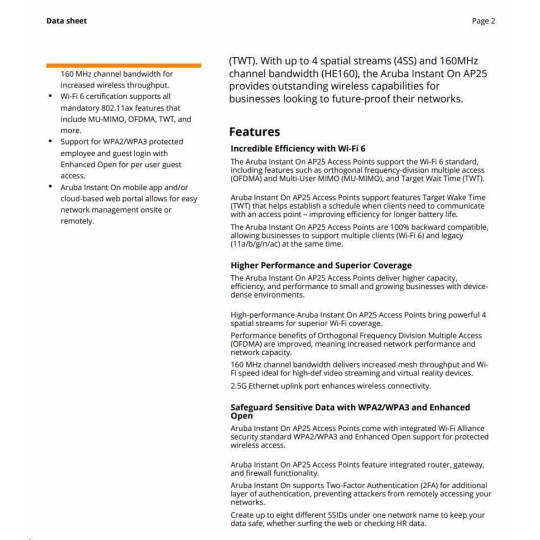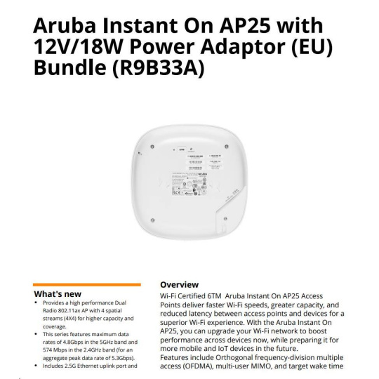 The HPE Networking Instant On Wi-Fi 6 Access Points portfolio is designed to meet the increasing volume of connected devices that face small businesses. Our range of Wi-Fi Certified 6 access points delivers superior performance, coverage, and speed at a competitive price that is perfect for small and growing businesses.