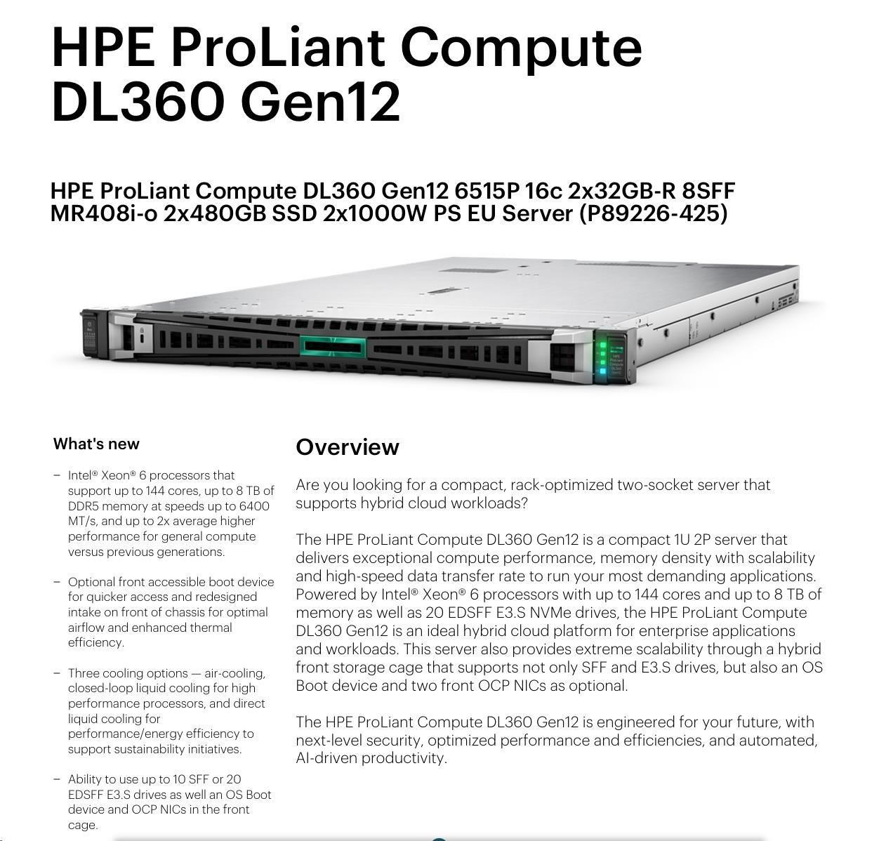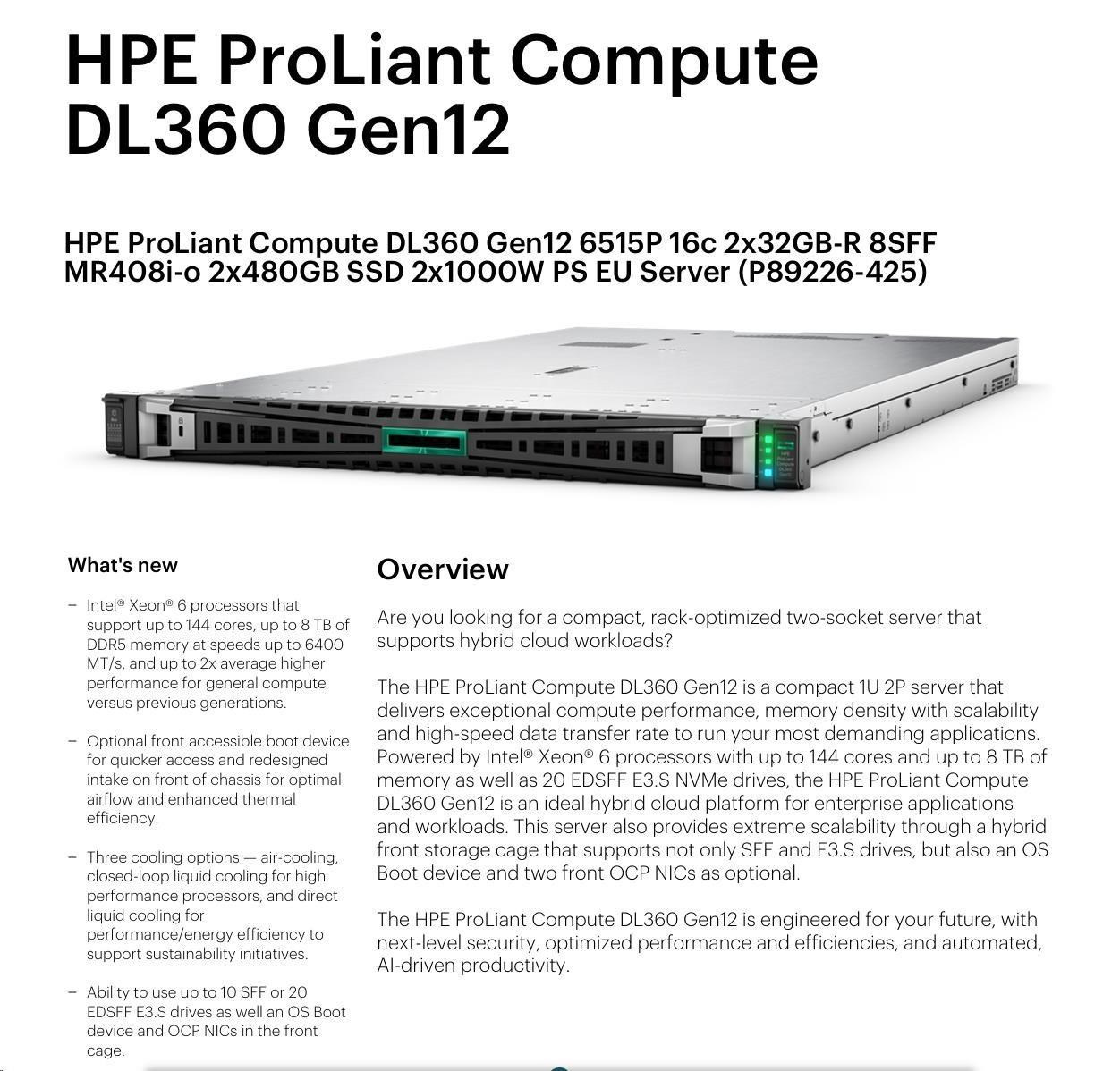 HPE PL DL360 Gen12 6515P (2.4/16C) 2x32G (P69727) 2x480G MR408i-o 8SFF 2x1000W 10GbE NBD333 Smart Choice