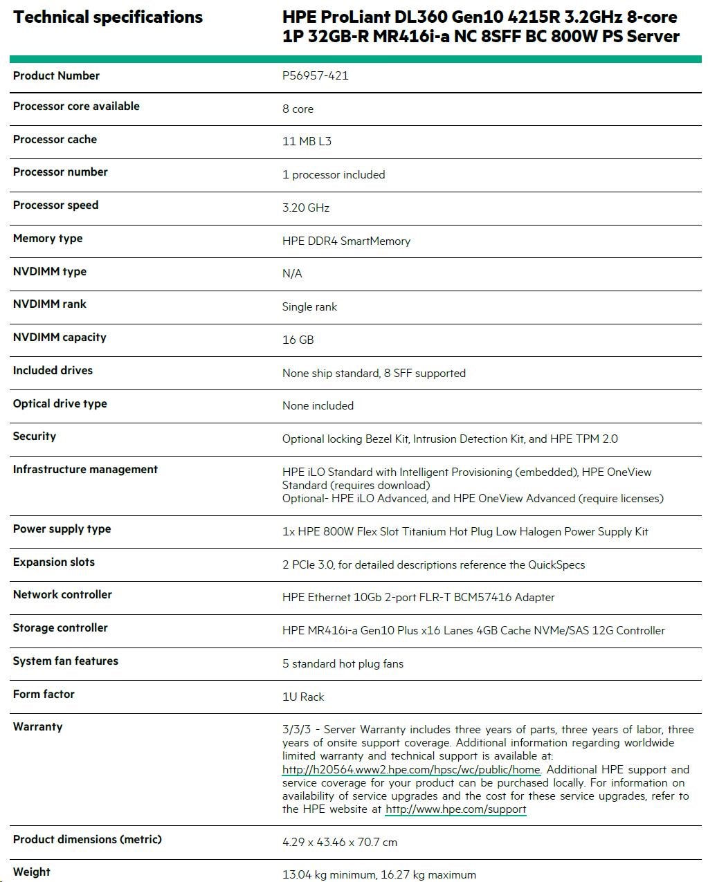 Model Name | HPE ProLiant DL360 Gen10 4215R 3.20GHz 8-core 1P 32GB-R MR416i-a NC 8SFF BC 800W PS Server |