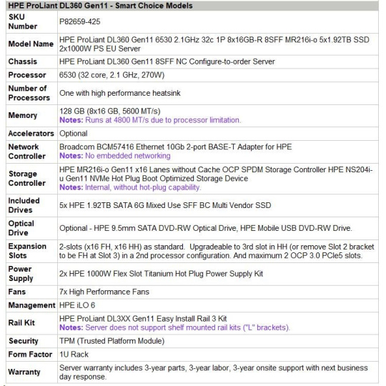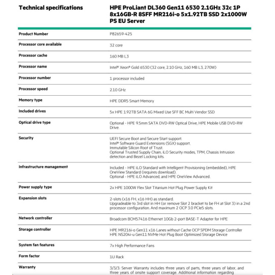 Product Number P82659-425 Processor core available 32 core Processor cache 160 MB L3 Processor name Intel® Xeon® Gold 6530 (32 core, 2.10 GHz, 160 MB L3, 270W) Processor number 1 processor included Processor speed 2.10 GHz Memory type HPE DDR5 Smart Memory Included drives 5x HPE 1.92TB SATA 6G Mixed Use SFF BC Multi Vendor SSD Optical drive type Optional - HPE 9.5mm SATA DVD-RW Optical Drive, HPE Mobile USB DVD-RW Drive. Security UEFI Secure Boot and Secure Start support. Intel® Software Guard Extensions (SGX) support. Immutable Silicon Root of Trust. Optional Trusted Supply Chain, iLO Security modes, TPM, Chassis Intrusion detection and Bezel Locking kits. Infrastructure management Included - HPE iLO Standard with Intelligent Provisioning (embedded), HPE OneView Standard (requires download). Optional - HPE iLO Advanced, and HPE OneView Advanced. Power supply type 2x HPE 1000W Flex Slot Titanium Hot Plug Power Supply Kit Expansion slots 2-slots (x16 FH, x16 HH) as standard. Upgradeable to 3rd slot in HH (or remove Slot 2 bracket to be FH at Slot 3) in a 2nd processor configuration. And maximum 2 OCP 3.0 PCIe5 slots. Network controller Broadcom BCM57416 Ethernet 10Gb 2-port BASE-T Adapter for HPE Storage controller HPE MR216i-o Gen11 x16 Lanes without Cache OCP SPDM Storage Controller HPE NS204i-u Gen11 NVMe Hot Plug Boot Optimized Storage Device System fan features 7x High Performance Fans Form factor Warranty 1U Rack 3/3/3: Server Warranty includes three years of parts, three years of labor, and three years of onsite support coverage. Additional information regarding worldwide limited warranty and technical support is available at: https://h20564.www2.hpe.com/hpsc/wc/public/home. Additional HPE support and service coverage, to supplement the product warranty, is available. For more information, visit https://www.hpe.com/support