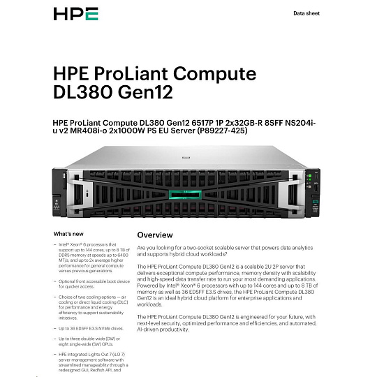 HPE PL DL380g12 6517P (3.2-4.2G/16C) 4x32G (P69727) 8SFF NS204i-uv2 MR408i-o 2x1000W 2p10T NBD333 Smart Choice