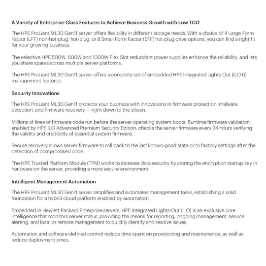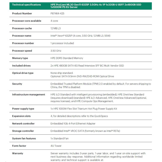 HPE PL ML30g11 6325P (3.5G/4C8T) 1x32G 2x480G SSD 8SFF VROC 1x1000W 4p1G NBD311 Smart Choice.