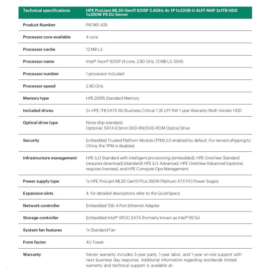 HPE PL ML30g11 6325P (3.5G/4C8T) 1x32G 2x960G SSD SATA 4LFF-HP VROC 1x1000W 4p1G NBD311 Smart Choice.