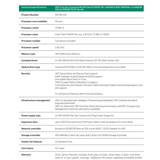 HPE PL ML350g12 6515P (2.4/16C) 1x64G (P69728) 2x480G MR408i-o 8SFF 2x1000W 1GbE NBD333 Smart Choice