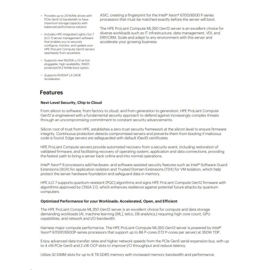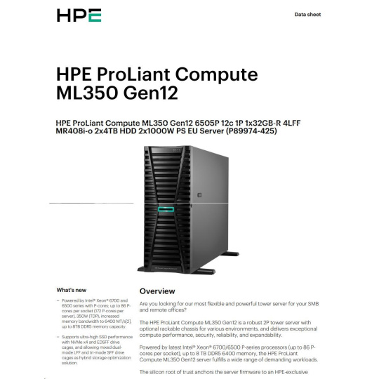 HPE PL ML350g12 6505P (2.2/12C) 1x32G (P69727) 2x4TB 4LFF MR408i-o2x1000W 1GbE NBD333 Smart Choice.