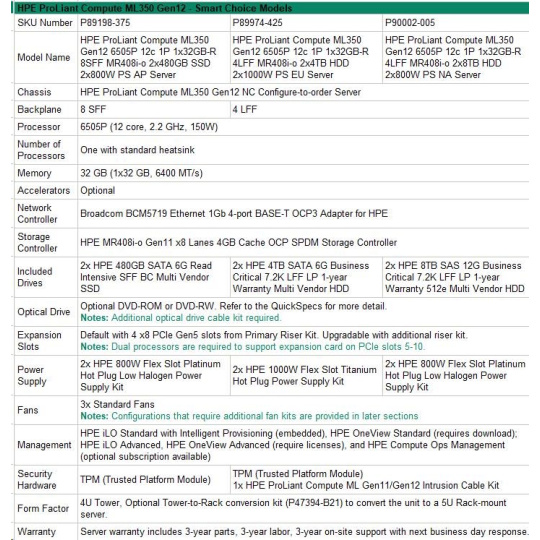 HPE PL ML350g12 6505P (2.2/12C) 1x32G (P69727) 2x4TB 4LFF MR408i-o2x1000W 1GbE NBD333 Smart Choice