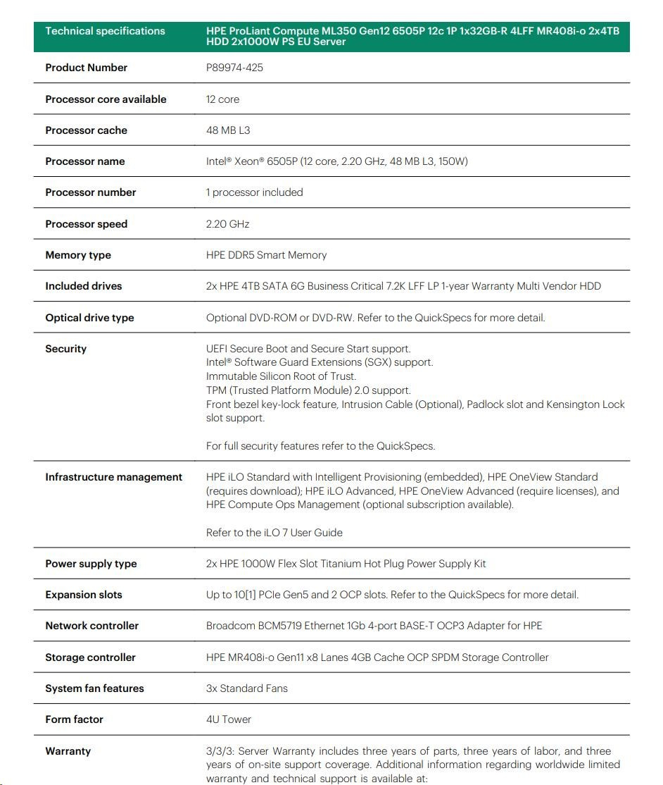 HPE PL ML350g12 6505P (2.2/12C) 1x32G (P69727) 2x4TB 4LFF MR408i-o2x1000W 1GbE NBD333 Smart Choice.