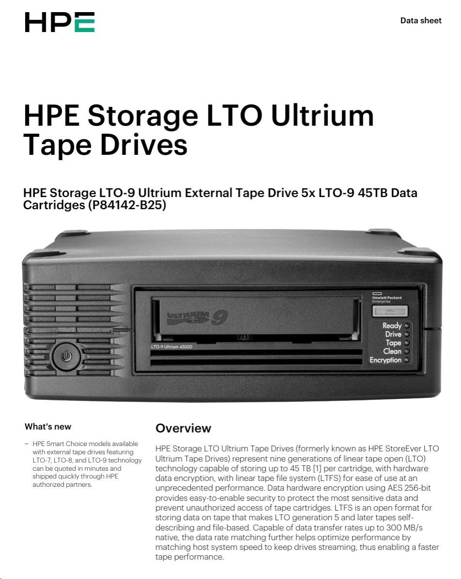 HPE Storage LTO-9 Ultrium External Tape Drive (BC042A) + 5x LTO-9 45TB Data Cartridges (Q2079A) Smart choice.