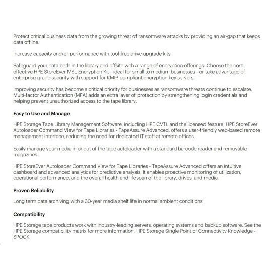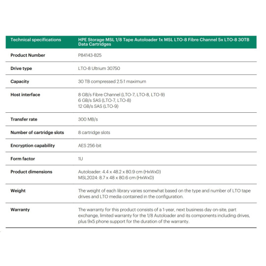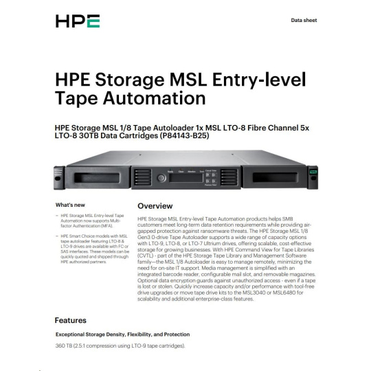 HPE Storage MSL 1/8 Tape Autoloader 1x MSL LTO-8 Fibre Channel 5x LTO-8 30TB Data Cartridges.