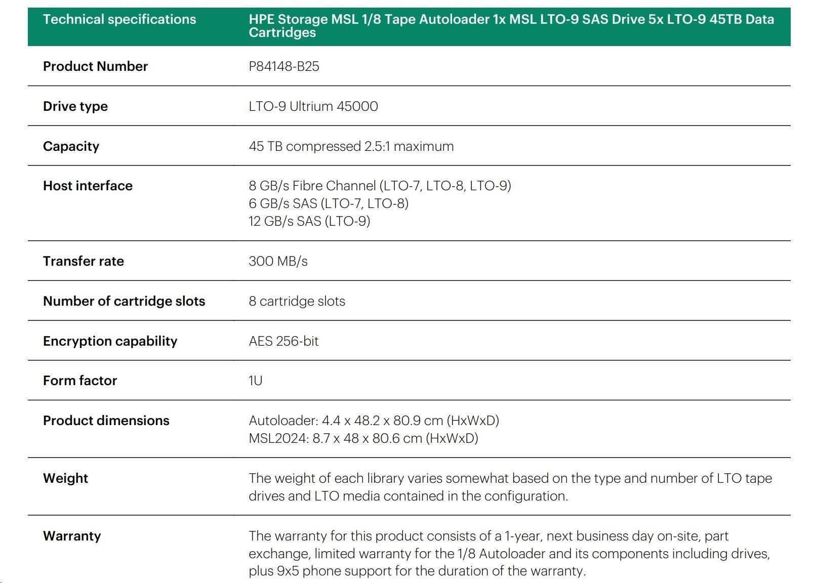 HPE Storage MSL 1/8 Tape Autoloader 1x MSL LTO-9 SAS Drive 5x LTO-9 45TB Data Cartridges.