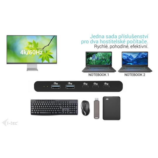 - Jedna sada příslušenství (klávesnice, myš, externí disky) pro oba hostitele – úsporné, efektivní a rychlé
