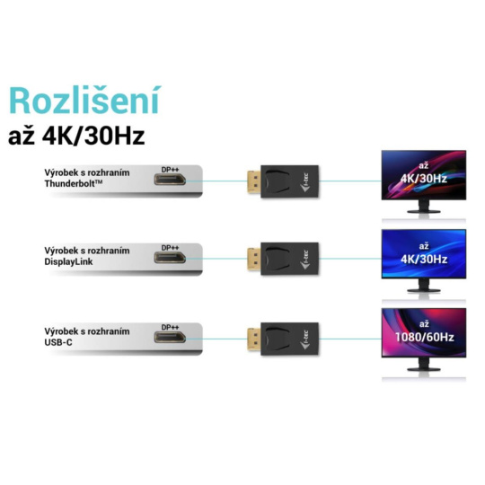 - V případě DisplayPortu s DisplayLinkem bude maximální rozlišení 4K / 30 Hz (např. dokovací stanice i-tec nebo videoadaptéry s číslem produktu začínajícím CAxxxxxxxxx).