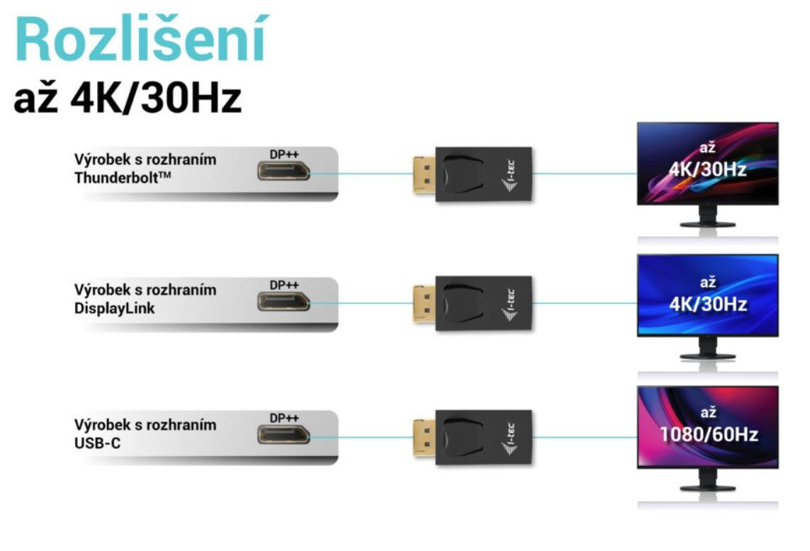 - V případě DisplayPortu s DisplayLinkem bude maximální rozlišení 4K / 30 Hz (např. dokovací stanice i-tec nebo videoadaptéry s číslem produktu začínajícím CAxxxxxxxxx).