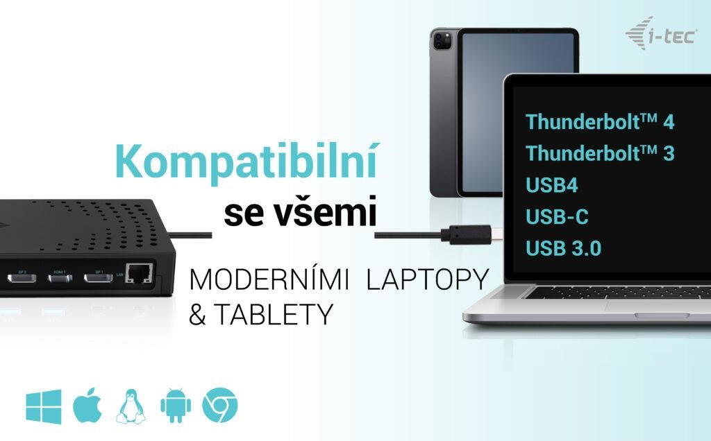 - Dokovací stanice je kompatibilní se všemi moderními notebooky (připojení přes porty USB 3.0, USB-C nebo Thunderbolt™ 3/4).