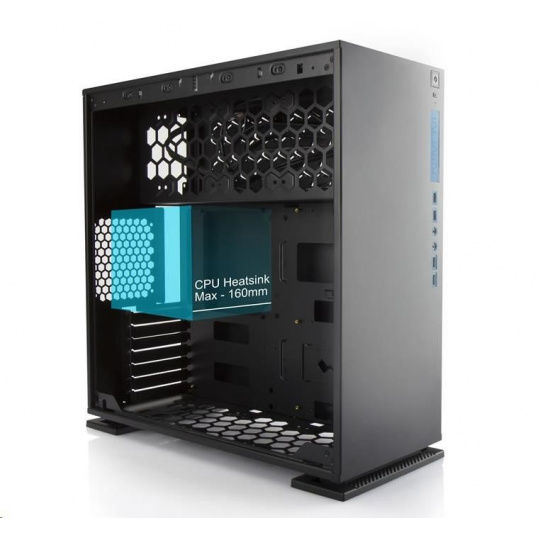 - Vevnitř je prostor pro grafickou kartu až do délky 350mm a CPU chladič až do velikosti 160 mm.
