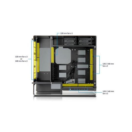 Oddělené pozice HDD a PSU zajišťují ideální proudění vzduchu skrz skříň ven zadními větracími otvory, aniž by se odvod teplého vzduchu brzdil o základní desky nebo grafické karty.